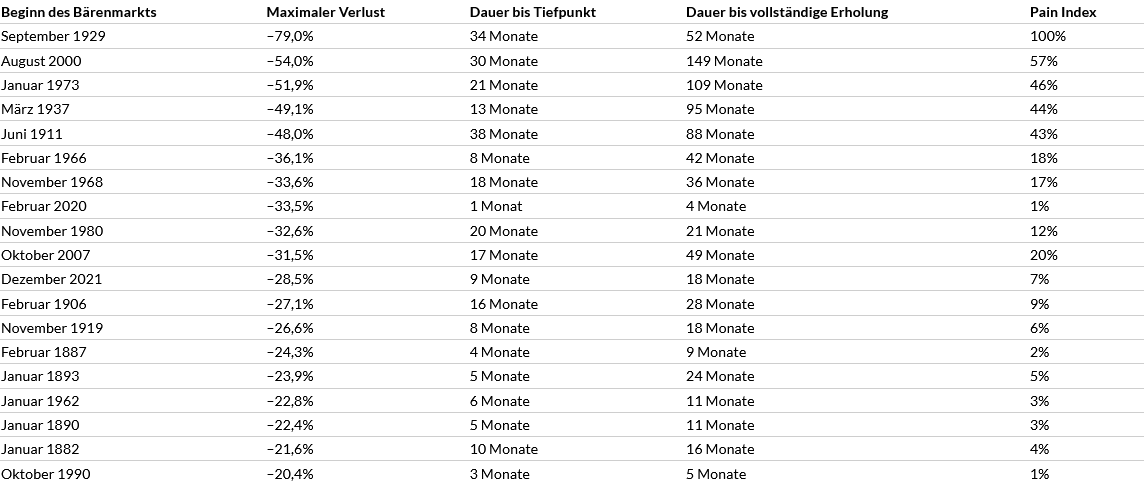 Interessant ist dabei auch die Einordnung jüngerer Markteinbrüche. So landet der Rückgang von Ende 2021 mit einem Minus von 28,5 % im historischen Ranking lediglich im Mittelfeld.
