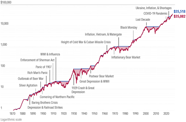 Was diese langfristige Betrachtung besonders eindrucksvoll zeigt: Ein Dollar, der 1871 in einen breit gestreuten US-Aktienindex investiert worden wäre, hätte inflationsbereinigt bis Anfang 2026 einen Wert von rund 35.082 US-Dollar erreicht.