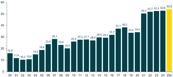 Hinzu kommt ein zweiter Kapitalrückflusskanal: Aktienrückkäufe. Auf Basis der zuletzt angekündigten Programme dürfte das Volumen 2026 bei rund 25 Mrd. Euro liegen, nach knapp 20 Mrd. Euro im Jahr 2025. Die Unternehmen erhöhen damit spürbar die direkte Kapitalrendite für ihre Aktionäre.