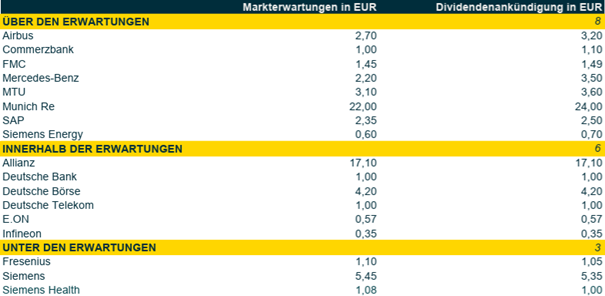 Die Zwischenbilanz fällt positiv aus: Acht Unternehmen überraschten mit höheren Dividenden als vom Markt erwartet. Dem stehen lediglich drei Enttäuschungen gegenüber, bei denen die Ankündigungen hinter den Analystenprognosen zurückblieben.