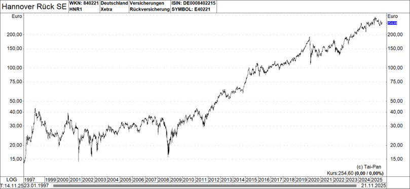 DZ Bank-Topfavorit für 2026, Nr. 4: Hannover Rück (ISIN: DE0008402215 - aktueller Kurs: 254,60 Euro – Kursziel: 314,00 Euro – Kurspotenzial: 23,3%)