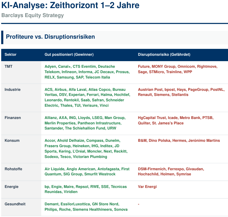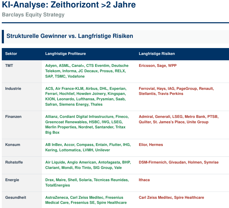 Eine Barclays-Studie zeigt, wie unterschiedlich KI in Europa wirkt: Einige Unternehmen profitieren, andere geraten unter Druck. Lesen Sie, ob auch Ihr Portfolio betroffen ist.