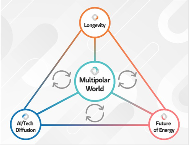 Genau hier setzt eine aktuelle Studie von Morgan Stanley an. Die Strategen des US-Investmenthauses haben darin vier globale Megatrends identifiziert, welche die Weltwirtschaft und damit auch die Kapitalmärkte in den nächsten Jahren fundamental umgestalten werden. Konkret geht es um Technologie-Verbreitung (Tech Diffusion), Langlebigkeit (Longevity), Multipolare Welt (Multipolar World) und Zukunft der Energie (Future of Energy).